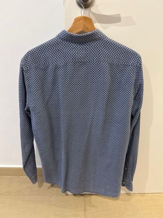 Camisa de manga larga con un estampado geométrico en tonos azules y blancos. Presenta un cuello clásico y dos bolsillos en la parte frontal. - Estampado lineal geométrico. - Cierre de botones. - Dos bolsillos de parche en el pecho.
