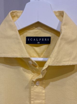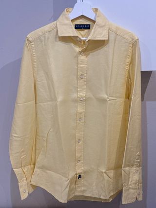 Camisa de manga larga de la marca Scalpers en color amarillo. Presenta un diseño con textura sutil y un pequeño detalle bordado en la parte inferior. - Cuello clásico. - Cierre de botones. - Puños abotonados.