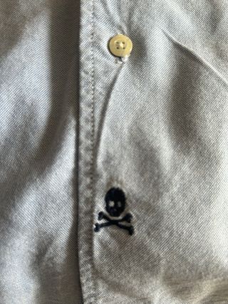 Camisa de manga larga con un pequeño detalle bordado., Calavera scalpers en zona baja . Camisa muy elegante , divertida ,para hombre de 185 cm ,muy elegante - Cuello tipo polo con botones. - Tejido de algodón. Se entrega limpia y planchada aprovéchala Costo 75 .mitad de orecio