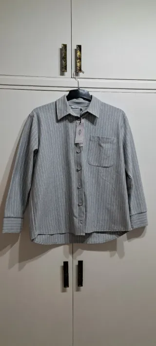 Camisa sin estrenar con etiqueta . De Stradivarius, talla M. La camisa es azul de polipiel , los botones están forrados del mismo tejido . Por dentro está la camisa forrada . En las dos últimas fotos muestro dos desperfectos mínimos que no se aprecian , uno en el hombro súper pequeño y otra en la parte inferior trasera de la camisa .