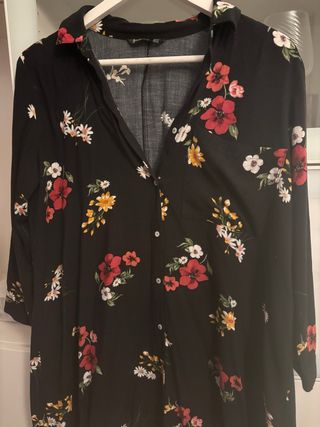 Vestido con estampado floral sobre fondo negro. Presenta un diseño de camisa con botones. - Manga larga. - Cuello camisero. - Estampado de flores rojas, blancas y amarillas.