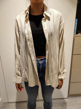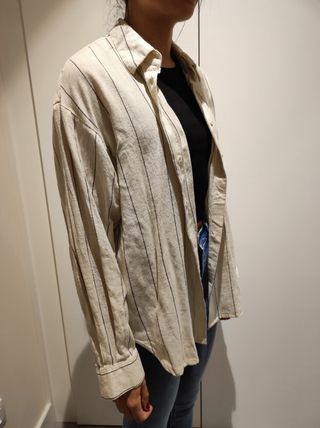 Camisa color crema y rayas negras de Stradivarius. Talla M. Marca Stradivarius Altura modelo 1,68m. Peso 60kg. Medida pecho 90A. Se hacen descuento por lotes.