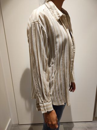 Camisa blanca y beige a rayas. Talla M. Marca Stradivarius. Altura modelo 1,68m. Peso 60kg. Medida pecho 90A. Se hacen descuento por lotes.