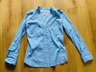 Preciosa camisa tejana de manga larga. Es de color azul claro y talla S. Diseño clásico con bolsillos de plastrón. Acabado desgastado.