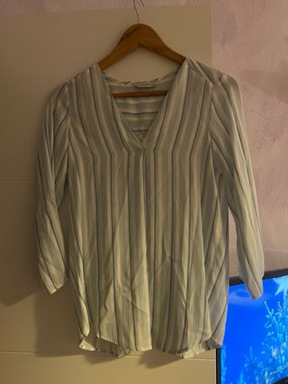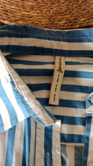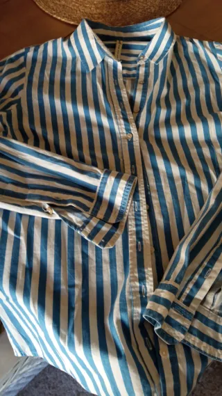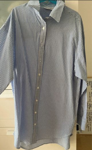 Stradivarius camisa de rayas blancas y azules, un poco más larga por la parte trasera y pequeñas aberturas en los laterales. Para usar sola, como sobre camisa o vestido camisero . Es una XS oversize, una o dos puestas, como nueva.(Mide 81/82 de largo)