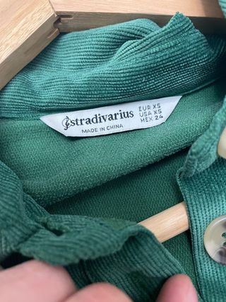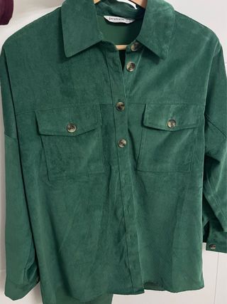 Camisa de pana en color verde de la marca Stradivarius. Talla XS pero es oversize. Yo uso una talla S/M y me va bien. Muy bien cuidada.