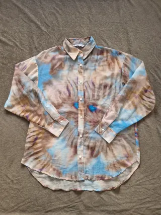 Camisa de estilo oversize con un llamativo estampado tie-dye en colores azul, marrón y morado. - Diseño con cuello - Manga larga - Cierre de botones