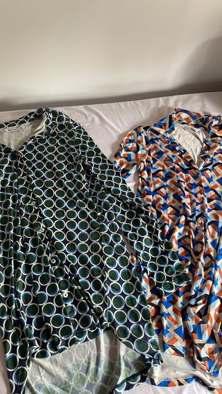Conjunto de dos camisas de manga larga con estampados llamativos. PRECIO NEGOCIABLE - Camisa con estampado de círculos en azul marino, verde y blanco. - Camisa con estampado geométrico en azul, naranja y blanco.
