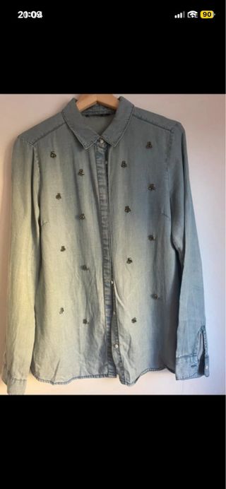 Camisa vaquera de manga larga con un diseño único. -efecto gastado - Adornada con pequeños abalorios. - Cierre de botones en la parte delantera. - Cuello clásico de camisa.