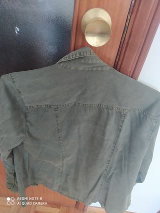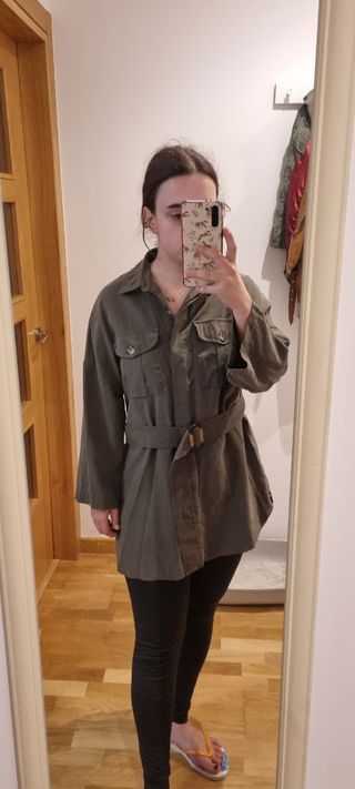 sobrecamisa verde militar con cinto, estilo oversize y con dos bolsillos funcionales. Apenas usada