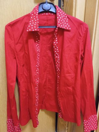 Preciosa blusa de la marca Stradivarius. Es una prenda única por su diseño original. - La parte superior es de color rojo y de tejido suave. - La parte inferior es de color azul claro con rayas blancas y tiene un estilo camisa. - Tiene botones en la parte delantera.