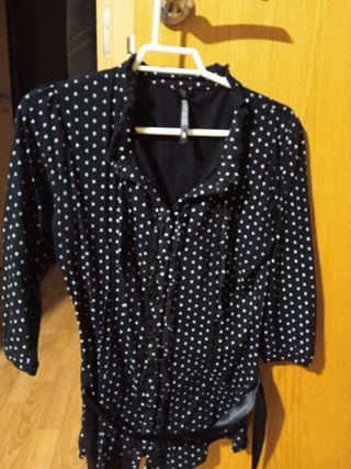Dos camisas estampadas muy monas, para distintos outfits. La negra con lunares es más larguita, manga francesa y aberturas por los lados, de Stradivarius y la azul de rayas es de Sfera, manga larga y finita, muy cómodas. Prácticamente sin uso, en perfecto estado. Las dos son S.