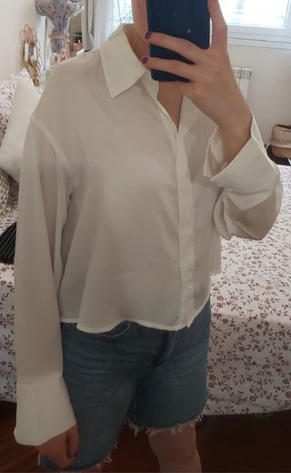 Color: Blanco Talla: S Marca: Stradivarius Descripción: Camisa crop blanca, con cierre frontal de botones. Tela ligeramente transparente. Tela fina y muy suelta.