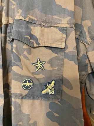 Camisa de estilo militar con estampado de camuflaje. Es una prenda versátil que puede usarse como camisa o sobrecamisa. - Diseño de camuflaje en tonos marrones y verdes. - Cierre de botones. - Dos bolsillos en la parte delantera. - Detalles de parches y estrellas bordadas en mangas y frontal. combínalo con más cosas de mi perfil y hago pack.
