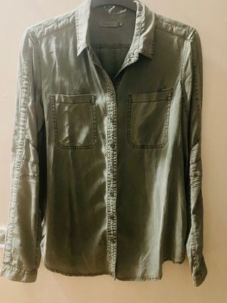 Camisa verde khaki de Calvin Klein Jeans. Marca la talla XS, pero el tallaje es grande. Yo suelo usar una M de otras marcas y me va bien. Material: 100% Lyocell En muy buen estado.