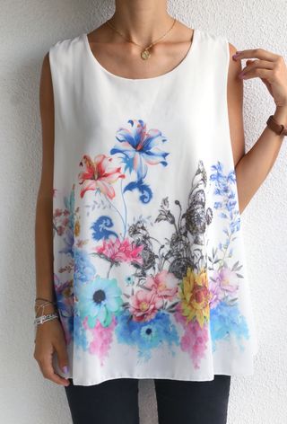 Camiseta, camisa o blusa de tirantes ancho de color blanco con estampado de flores de colores. Talla L 40, también valdría para XL 42 44, para S 36 queda como en las fotos, amplia, estilo oversize. La parte delantera es tejido de gasa y la trasera de algodón, tiene forro interno. Usada en dos eventos, por tanto en perfecto estado. Es cómoda, elegante y queda muy bien. Medidas : Largo : 68cm Ancho de sisa a sisa : 50cm Sí hago envíos, sólo VÍA WALLAPOP. Cualquier duda, preguntar sin miedo. Pásate por mi perfil a echar un vistazo :)