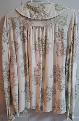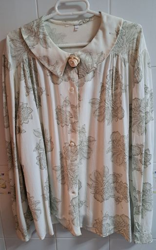 Camisa de manga larga con un diseño único. Es una talla XS grande - Estampado floral abstracto en tonos beige y blanco. - Cuello clásico y cierre de botones. - Tejido satinado con caída.