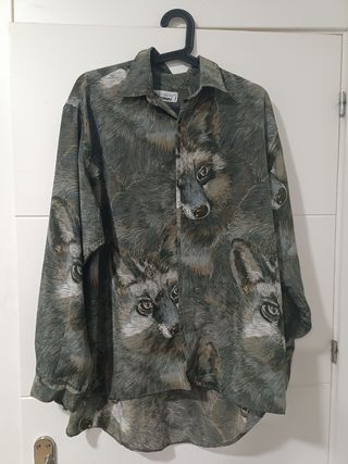 Camisa estampado cebra de colores, Manga ancha. Botones forrados en rojo y bies rojo en botonadura y puños. Talla bastante grande.