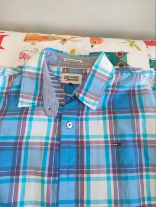 En buen estado. Manga larga y sin botones en el cuello. Cuadros celestes,blancos y rojos. Talla M. Hago envíos.Primaveral o veraniega incluso.Preciosa camisa a cuadros de la marca Tommy Hilfiger. Es una prenda elegante y cómoda, perfecta para cualquier ocasión. - Diseño de cuadros en tonos azules y blancos. - Manga larga. - Cierre de botones.