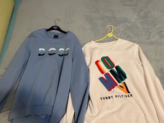 Conjunto de dos camisetas de marcas reconocidas. - Camiseta azul con logo BOSS. - Camiseta blanca con logo multicolor de Tommy Hilfiger.