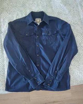 Camisa azul, con bolsillos y botones frontales. También se puede remangar. Tiene pespuntes y cuello inferior de polipiel (algunas zonas desgastadas pero como queda por debajo, no se ve). Talla M. Ideal para combinar con vaqueros y pantalones negros.