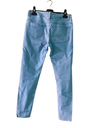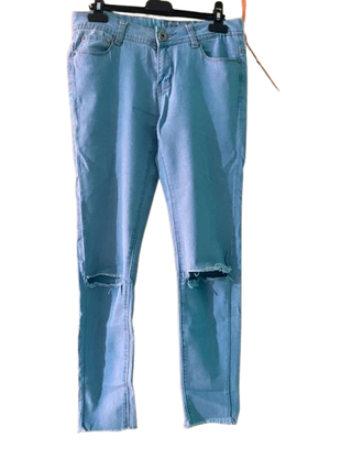 Pantalón vaquero en color azul claro, de corte ajustado (slim fit) que estiliza la figura. Presenta detalle desgastado con rotos en ambas rodillas, ideal para un look casual y moderno. ✨ Características: Color: azul claro Corte: slim fit Cintura con cierre de botón y cremallera Bolsillos delanteros y traseros Bajos sin rematar para un estilo desenfadado 📏 Estado: en buen estado, con desgaste de fábrica en las rodillas (no es por uso). Perfecto para combinar con camisetas, sudaderas o camisas para un outfit diario. MEDIDAS: - ancho de cintura: 69 cm - ancho de cadera: 73 cm - largo del pantalon: 78 cm - largo del tiro: 22 cm