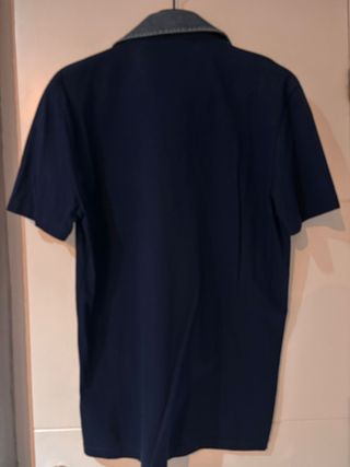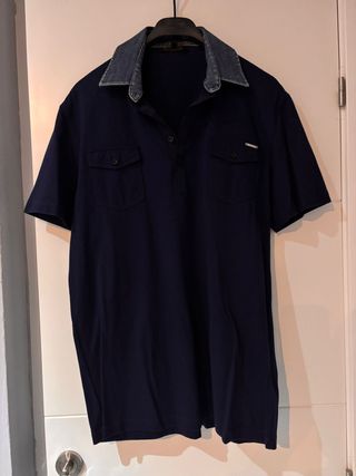 Polo/camiseta de manga corta Antony Morato, color azul marino, con cuello tipo camisa en tejido vaquero (denim). Tiene tapeta con botones y dos bolsillos delanteros con solapa y botón, estilo casual/urbano ideal para vestir informal pero con toque elegante. Estado: buen estado (según fotos).