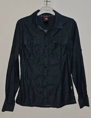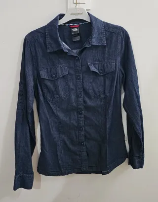 Preciosa camisa The North Face en color azul marino estilo camisa vaquera. Tiene talla S/P (S pequeña) Pero más bien es una XS porque tengo otras camisas de la marca en talla S/P que me quedan bien, sin embargo, esta me queda muy justa (casi incómoda) Esta nueva pero lleva varios meses guardada (colgada en el armario, no en trastero ni metida en caja) Compruebe las medidas en las fotos antes de comprar. Detalles de la camisa: Cierre con botones. Dos bolsillos en el pecho (cierre de tapa con botón) y otro bolsillo bajo en la parte derecha (cierre con cremallera invisible) Composición: 69% Algodón 31% Poliester (no cede)