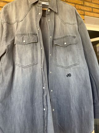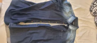 Camisa vaquera de manga larga para mujer. Presenta un diseño clásico con cuello y botones frontales. - Dos bolsillos en el pecho con botón. - Bajo deshilachado. - Tejido vaquero.talla 44/46 puesta solo una vez.en mi perfil tengo más cosas