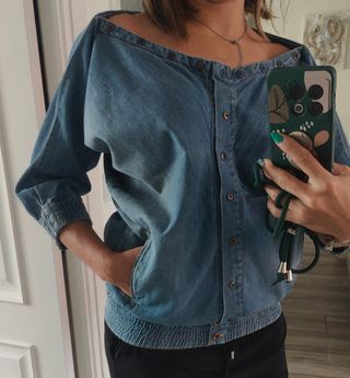 Es camisa vaquera tipo cazadora con flecos brillantes en los lados y por detrás solo 1 puesta talla S/M