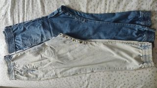 2 Vaqueros con botonera entre las piernas, anchos, con gomas arriba y abajo.