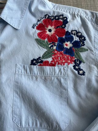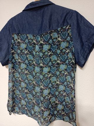 Camisa vaquera de manga corta con estampado étnico en el dobladillo de las mangas y en el bolsillo delantero. Cierre mediante botones. Para saber más o conocer las medidas exactas, no dudéis en escribirme por chat sin compromiso, respondo rápido 😊.