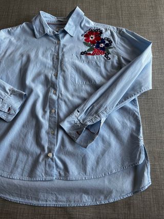 Camisa Popelin de la marca Tommy Hilfiger. Lleva un estampado floral en la parte superior izquierda. La parte de atrás es ligeramente más larga. Esta en buen estado. Queda muy bien con vaquero o pantalón blanco.