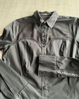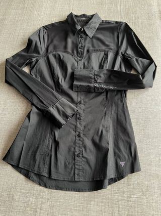 Camisa negra de la marca Guess. Corte entallado. Es muy elástica. La parte de arriba es transparente. La parte central termina en forma de corazón. El botón de arriba no es original. Queda muy bien con vaquero, es muy favorecedora. Esta en muy buen estado.
