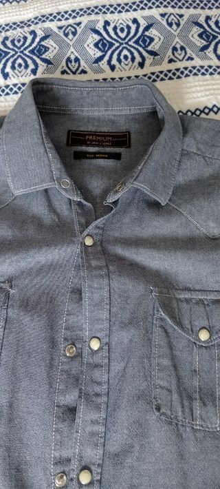 Camisa vaquera con estampado étnico en el dobladillo de las mangas y en el bolsillo delantero. Para saber más o conocer las medidas exactas, no dudéis en escribirme por chat sin compromiso, respondo rápido 😊.