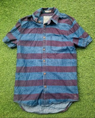Camisa vaquera !Solid de manga corta, de color azul y granate/morado a rayas. Talla S, usada sólo una vez.
