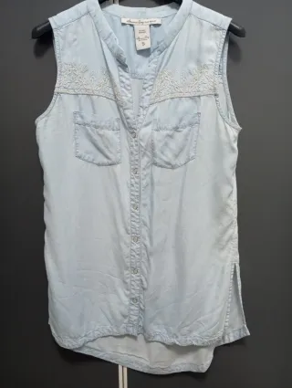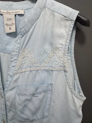 Camisa vaquera sin mangas con un diseño moderno y detalles bordados. - Cuello camisero. - Cierre de botones. - Dos bolsillos en el pecho. - Aberturas laterales en el bajo. 👇🏼👇🏼👇🏼 (En mi perfil hay más cositas a buen precio, crea tu lote y benefíciate de un descuento)