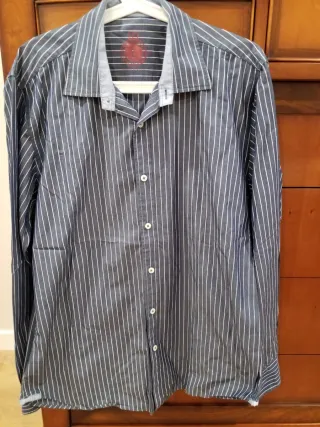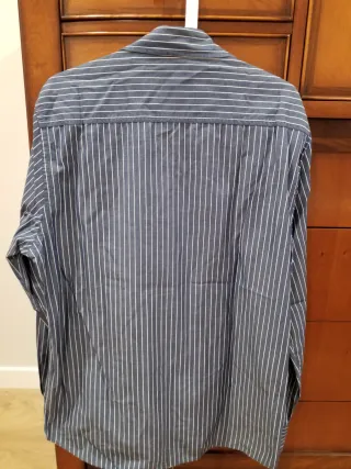 Camisa de hombre de estilo clásico en color azul marino con finas rayas verticales blancas, un diseño que estiliza la figura y combina fácilmente con cualquier look. Confeccionada en algodón, un tejido ligero y cómodo, ideal tanto para uso diario como para ocasiones más formales. Cuenta con cuello clásico, cierre frontal de botones blancos y manga larga con puños ajustables. El corte es recto y favorecedor, ofreciendo un estilo atemporal. Lleva un interior de cuello en tono azul claro, que aporta un toque discreto y elegante. Perfecta para llevar con vaqueros, pantalón chino o un look más formal. La camisa está en un estado excelen