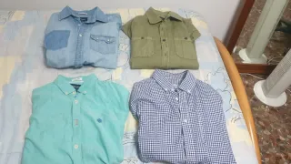 Lote de cuatro camisas de la marca Springfield. - Camisa vaquera de manga larga. - Camisa verde de manga corta con bolsillos. - Camisa azul claro de manga larga. - Camisa de cuadros azul marino y blanco de manga larga.