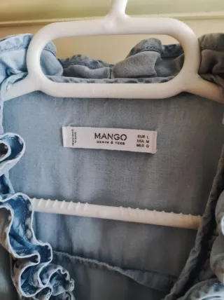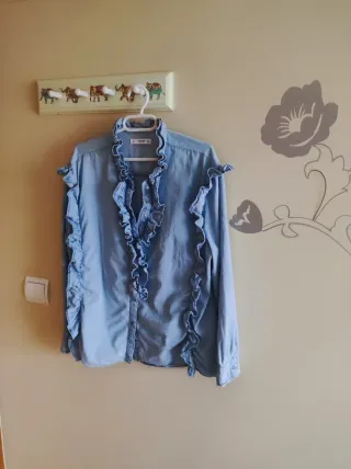 Camisa vaquera de Mango con un diseño original y femenino. Preciosa!! Vaquero fino azul clarito. Sin apenas uso. Está nueva - Mangas largas. - Cuello redondo. - Cierre de botones. - Adornada con volantes.