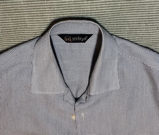 Camisa de vestir clásica de la marca Mirto. - Diseño a rayas finas en azul y blanco. - Cuello camisero. - Dos bolsillos en el pecho con botón.