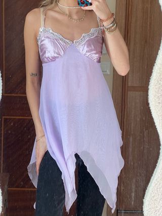 Precioso top estilo fairycore con detalles de lentejuelas. - Diseño asimétrico. - Tejido ligero y vaporoso. - Adorno de encaje en el escote.