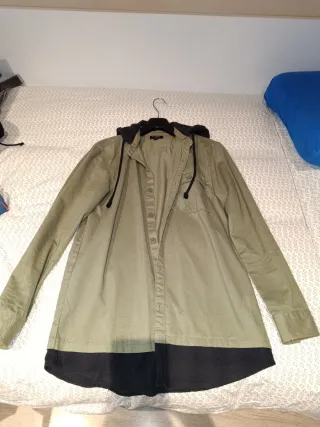 Esta prenda es una camisa tipo sobrecamisa de la marca PullandBear, caracterizada por su estilo vintage británico y diseño con capucha, logo en la espalda