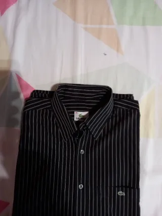 Camisa de vestir de manga larga con un diseño de rayas verticales finas. - Cuello clásico. - Cierre de botones. - Puños abotonados. - Logo de la marca bordado en el bolsillo. - Comprada en tienda Lacoste de la Vaguada Madrid.