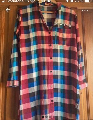 Camisa larga con estampado de cuadros multicolor y detalle New York bordado. - Diseño de cuello mao. - Cierre de botones. - Manga larga. - Largo hasta medio muslo.
