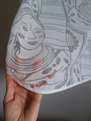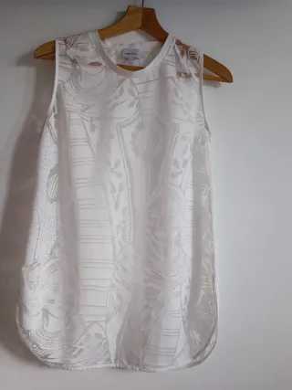 Camisa sin mangas con un diseño gráfico de figuras. - Tejido ligero y semitransparente. - Estampado detallado en relieve. - Corte recto y cómodo, con abertura lateral en la parte de abajo -Talla XS pero da más talla