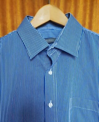 Camisa de vestir para hombre con un diseño clásico de rayas verticales. - Marca: Dustin - Color: Azul y blanco - Talla: L (equivalente a 42-44 / 52-54) - Corte: Regular - El precio se debe a que tiene varias puestas y en la zona de las axilas está la tela algo oscurecida. Se quita con productos para las camisas pero ahora no tengo y no lo puedo limpiar asique tengo que mandar la camisa así.