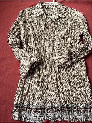 Camisa de seda con un estampado de lunares marrones sobre fondo blanco. Cuello camisero y botones frontales. Talla 40 100% seda - Manga larga con botón para sujetar al codo - Detalle de fruncido en la parte delantera. - Bajo con un estampado geométrico en contraste. Largo: 69 cm Largo mangas: 60 cm Pecho: 48 cm Hombro: 40 cm