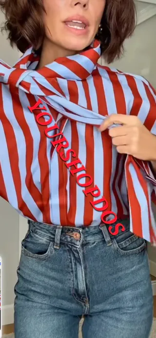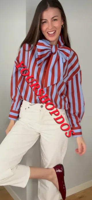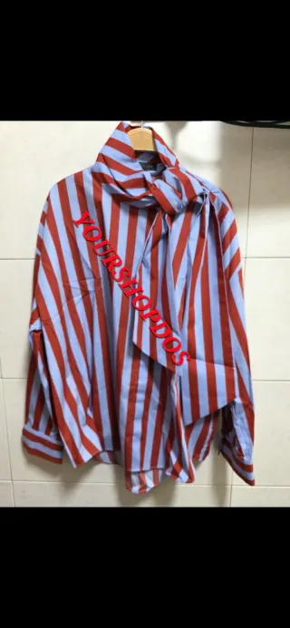 Camisa de Zara con un llamativo diseño de rayas verticales en rojo y azul. Presenta un lazada frontal que le da un toque elegante y moderno. - Diseño de rayas verticales. - Lazada frontal. - Manga larga.