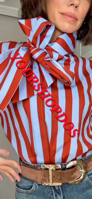 Camisa de rayas con un llamativo lazo en el cuello. - Diseño de rayas verticales. - Detalle de lazo grande en la parte delantera. - Mangas largas abullonadas.